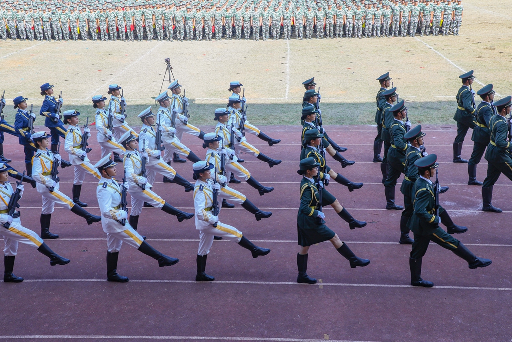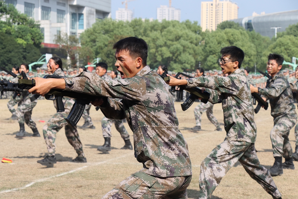 军事技能汇报表演精彩纷呈。捕俘刀、军体拳、教官刺杀操、反恐演练等项目轮番上演。同学们动作整齐划一,招式刚劲有力,呐喊气势如虹,充分展现新一代衡师人的蓬勃朝气与钢铁作风。“五星红旗迎风飘扬……”全体师生激情澎湃,高唱《歌唱祖国》。