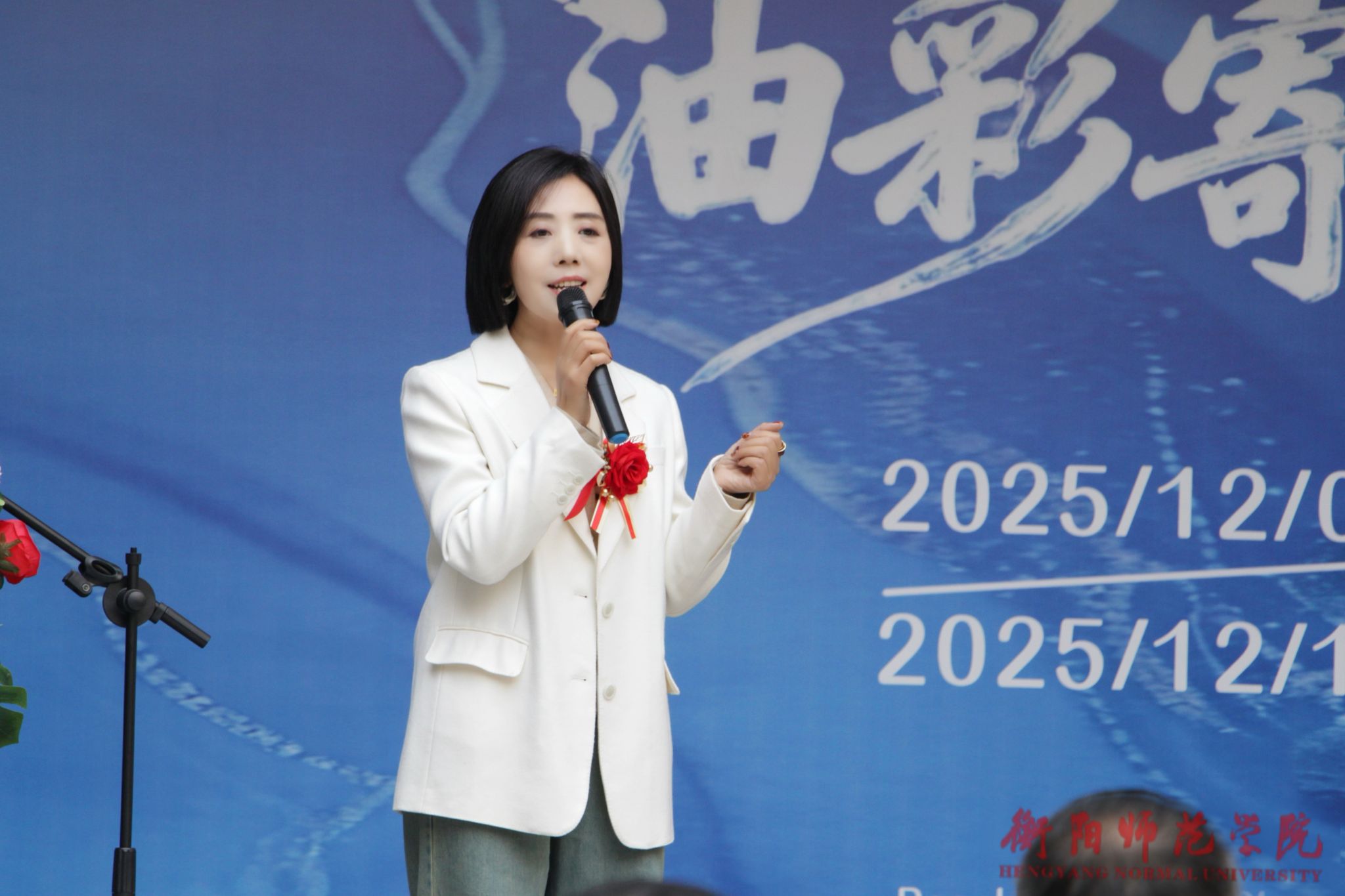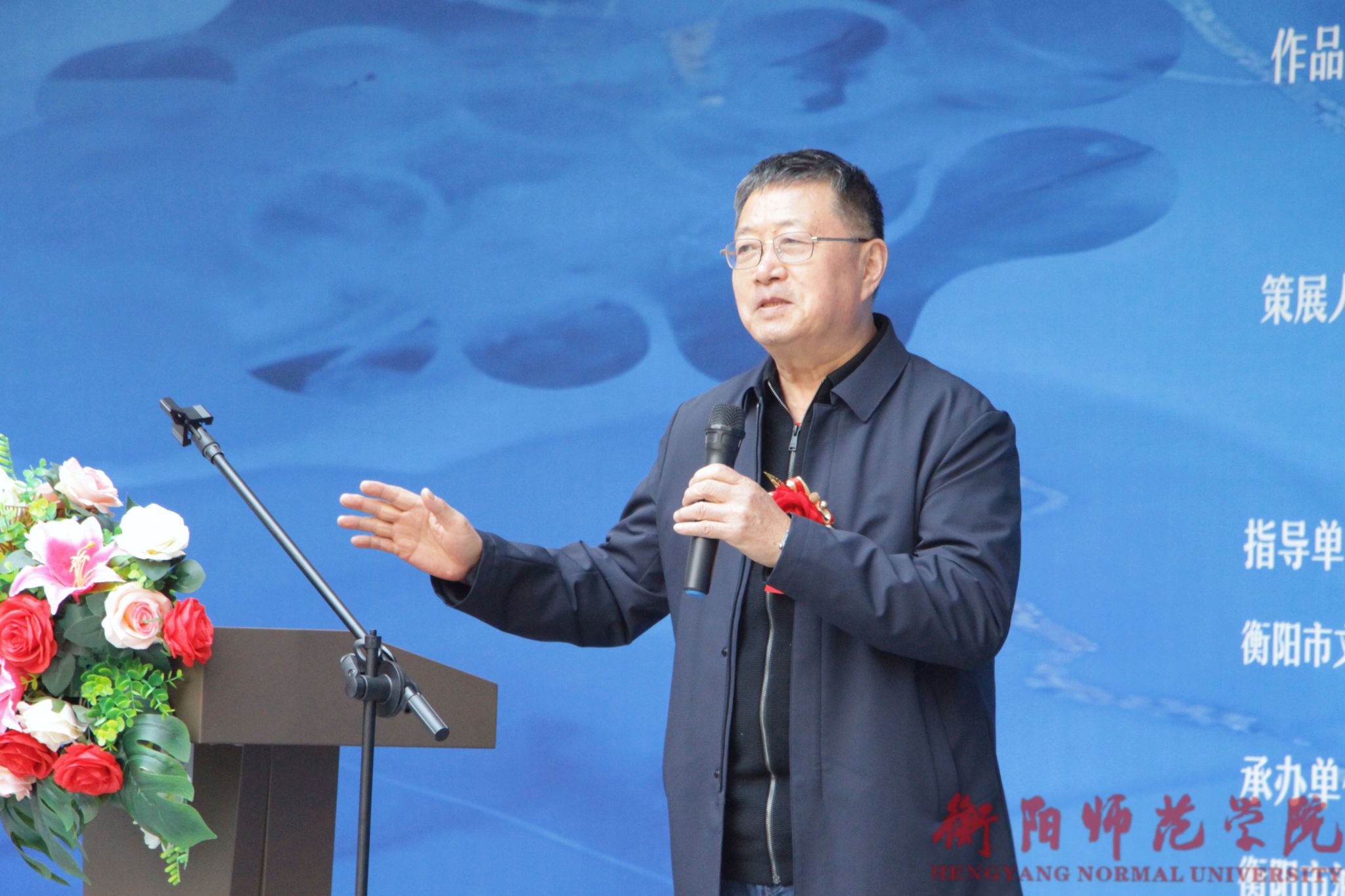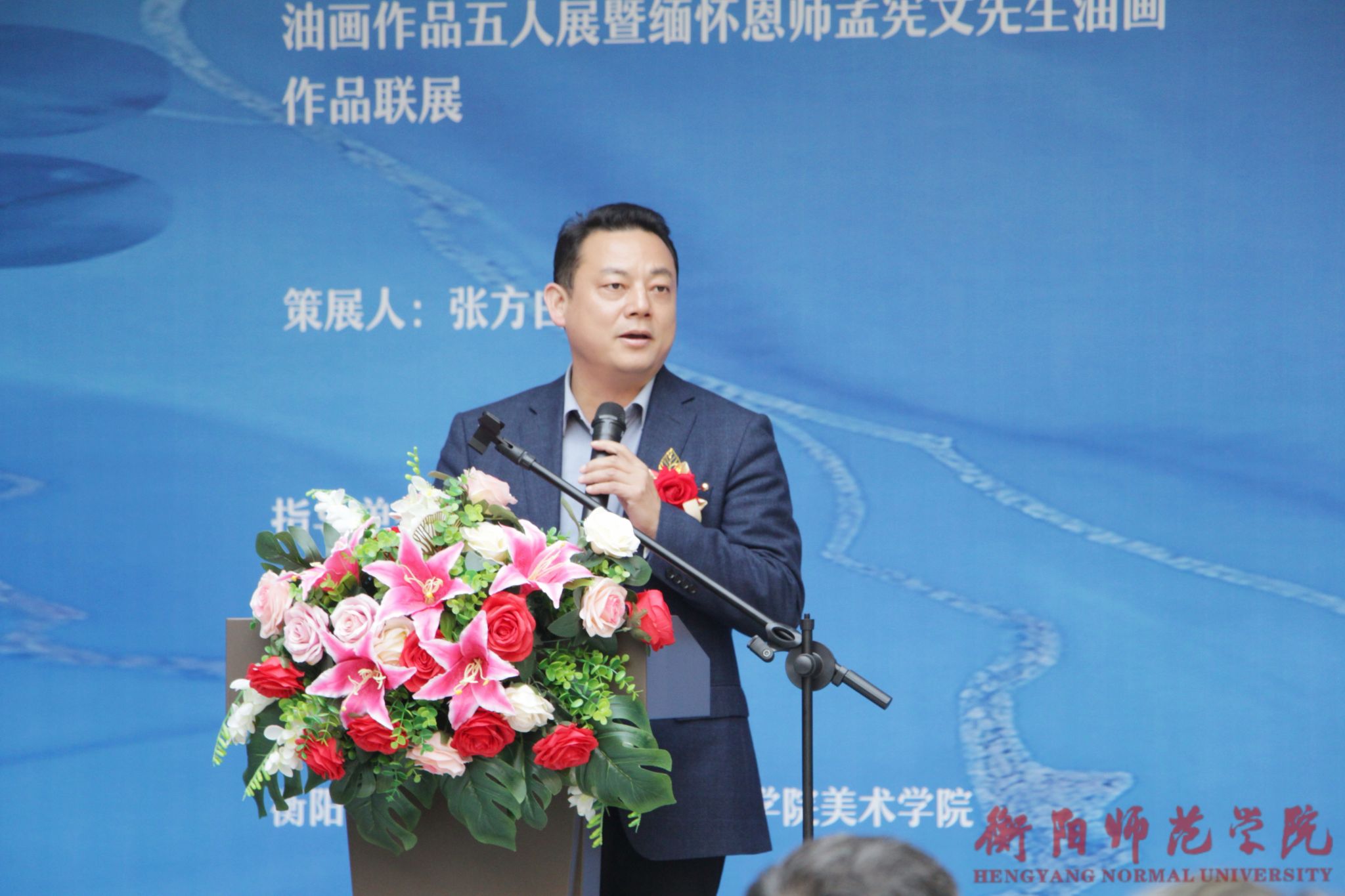 魏晓林在致辞中指出,孟宪文先生投身美术教育事业近40载,曾担任我校美术学院院长,是衡阳油画界的杰出领军人物。他秉持“油彩融合中国大写意”的独特创作风格,塑造出“苦涩遒劲”这一鲜明的艺术标识。他不仅积极牵头推动我校美术学科的蓬勃发展,更精心培育了一大批优秀的美术专业人才,其“潜心育人、执着艺术”的崇高精神,深深融入学校育人工作的血脉之中。五位联展艺术家作为孟宪文先生的学生,他们的作品在色彩运用、语言表达以及质感呈现等方面,既实现了对先生艺术风格的传承,又进行了大胆创新,是先生“教而有方、育而不束”先进育人理念的生动实践,充分彰显了我校“以师者典范铸魂,赓续育人初心”的精神传承。