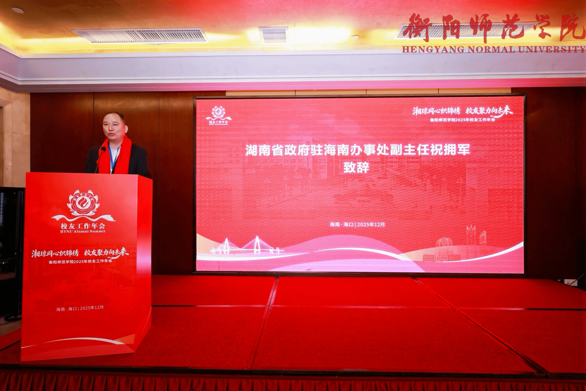 祝拥军在致辞中祝贺年会召开,并充分肯定我校办学历史悠久、育人成果丰硕,为湖南乃至全国培养了大批优秀人才。他指出,我校广大校友扎根海南,服务两地,已成为推动湘琼交流合作与自贸港建设的重要力量。他强调,当前湘琼两省合作日益紧密,为校友事业发展提供了广阔舞台,他希望广大校友继续发挥桥梁纽带作用,把握机遇、积极作为,共同谱写湘琼协同发展新篇章。