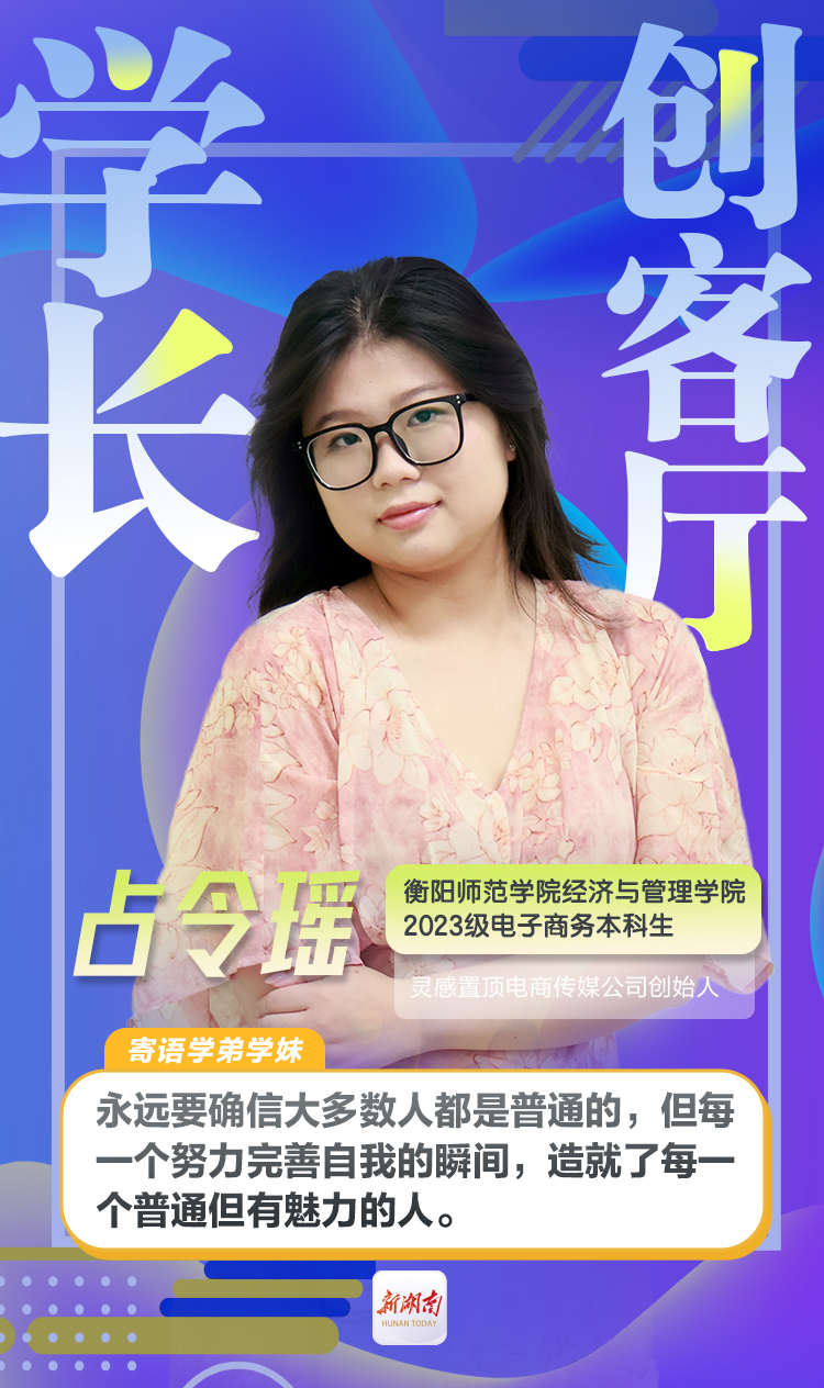 “成功了是成功,没成功就是成长,无论怎么样都是收获。”这句话是占令瑶的创业信条。她是衡阳师范学院的一名大三学生,同时也是一位刚刚起步的创业者。今年九月,她带着灵感置顶电商传媒公司入驻学校创业园。这位经历过两段实习打磨、在大创赛上积累了扎实创业理念的年轻创业者,正和团队一同开启全新的创业征程。