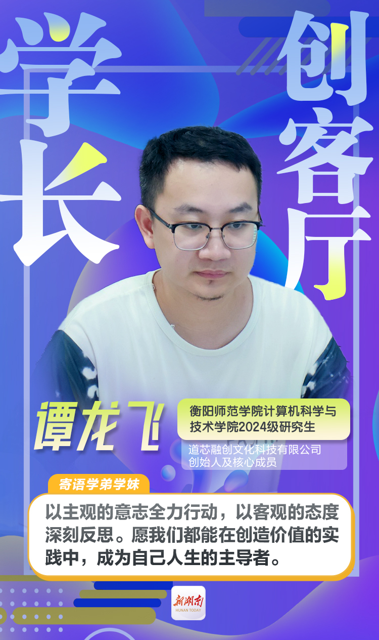 谭龙飞,衡阳师范学院计算机科学与技术学院2024级研究生,道芯融创文化科技有限公司创始人及核心成员。他敏锐地捕捉到数字技术与实体经济深度融合的时代脉搏,主攻“文旅+小游戏”创新赛道。其团队始终致力于破解地方文旅品牌传播与中小型商家数字化营销的痛点与难题,以科技赋能为核心,旨在有效振兴实体经济、激发消费新活力,探索出一条独具特色的“科技+文化+消费”的创业之路。